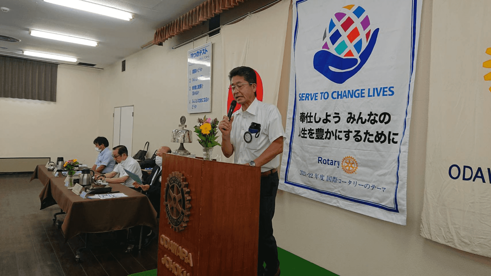 | 12:30~ | 開会点鐘:柳井 渉 会長 ロータリーソング「それでこそロータリー」 スピーカー及びビジター紹介 慶事祝福 会長挨拶 幹事・委員会報告 出席・ニコニコ箱報告 |