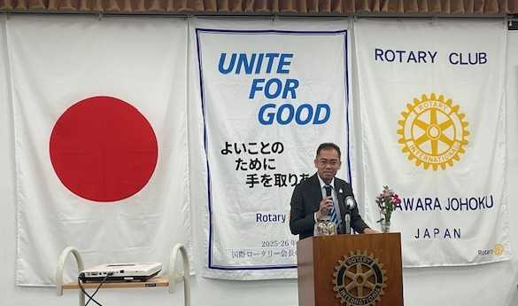 | 12:30~ | 開会点鐘:須藤会長 ロータリーソング「奉仕の理想」 スピーカー及びビジター紹介 慶事祝福 会長挨拶 幹事・委員会報告 出席報告・ニコニコ箱発表 |